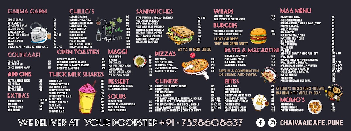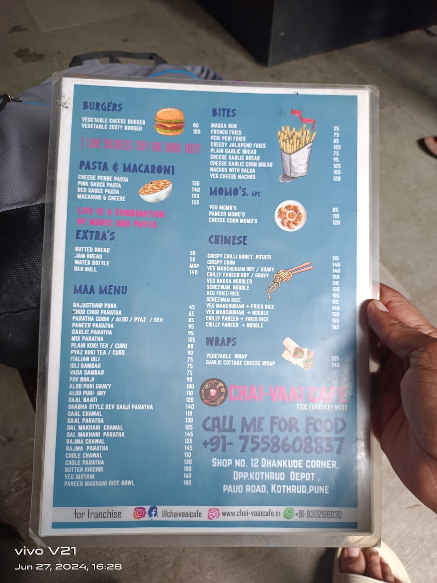 Chai Vaai Cafe, located in the vibrant Kothrud area of Pune, is a delightful haven for tea lovers and food enthusiasts alike. With a menu crafted to inspire warmth and comfort, the cafe specializes in a range of aromatic teas, including Ginger Chaah and Masala Chaah, each priced affordably at ₹15 and ₹20 respectively. For coffee aficionados, options like Cold Kaafi and Mocha Kaafi promise a refreshing experience on warmer days.